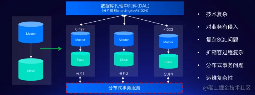 从单表到分库分表的改造普遍要求带sharding key作为数据拆分及路由依据,这样业务逻辑被迫进行改造,比如对多表join的场景很难通过中间件去解决、非sharding key的查询被迫要扫片性能则非常低、排序/分页/聚合计算问题,等等。为了解决数据拆后聚合的问题,通常要在整个业务链路上部署复杂的中间件,这给稳定性维护及业务健壮性带来一些挑战。