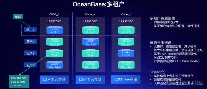 在TiDB6.0里面有多租户概念、虽然也实现了物理隔离,跟OceanBase基于内核虚拟化技术不同的是,TiDB是通过资源打标+调度的方式来实现的,个人觉得OceanBase在这方面要更胜一筹,分布式数据库下租户应该成为一种标配能力,一方面对私有云部署维护管理更加友好,另外对用户而言分布式就是一个无限大的单机数据库不用担心容量跟性能问题,且资源是隔离的。
