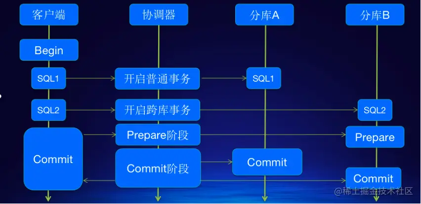出于对ACID完整性支持的考虑,由中间件形态构成的分布式数据库中解决分布式事务问题,通常解决方案都是差不多的,即两阶段提交(2PC)。