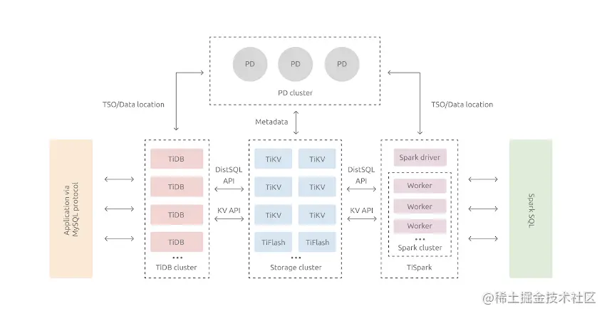 我们再从TiDB架构图上看(如下图),对比之下,OceanBase似乎更加简洁一点,起码组件没那么多(部署不够友好)不过这似乎也不是什么大的问题,况且TiDB提供了简洁的部署方案,不得不说TiDB真的很聪明特别懂用户心思,不管是对一个简单的部署,还是一开始选择基于MySQL协议去研发,又或者是围绕MySQL生态打造的各种工具等等都深得用户心意,这一点跟极力试图通过技术证明自己牛逼的产品,走的是不同路子。
