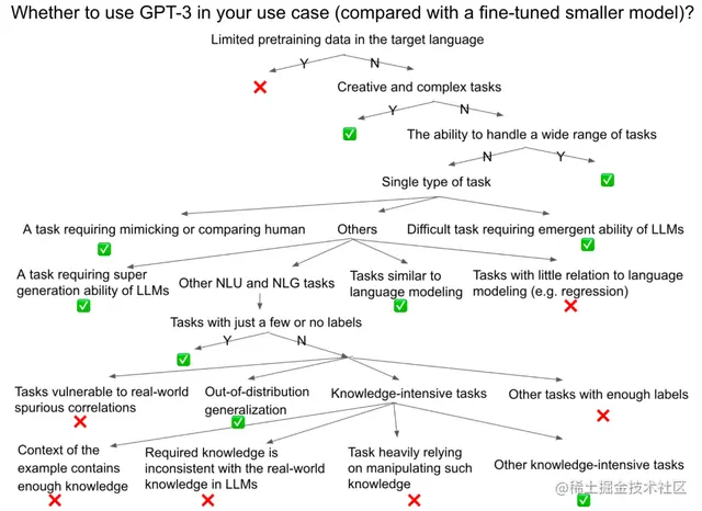 注意到,我主要关心的是将完成任务的精确度作为度量,但仍然存在很多其它重要的维度,例如:有害性(toxicity)、公平性等,它们也应该在决定是否使用 GPT-3 时被纳入考虑,正如 HELM 的文章中所呈现的。下图展示了一个粗略的决策流程,希望它能够作为一个有用的实践指南,无论对于已有任务还是一个全新的任务。