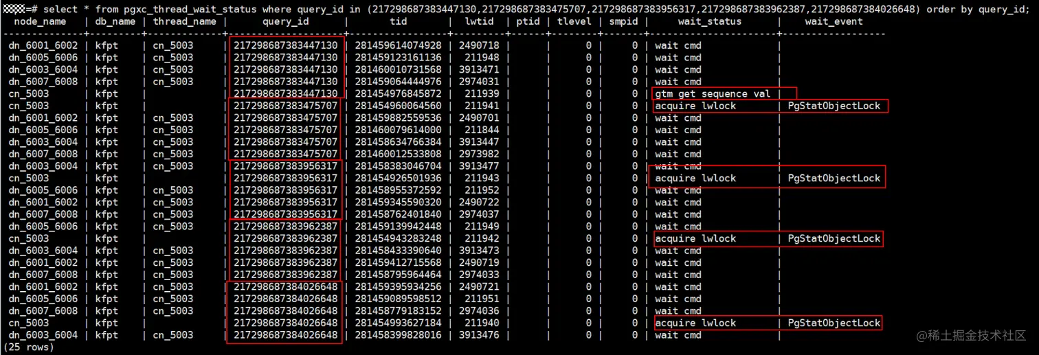 如图所示,由于CDM作业起了5个并发,因此在活跃视图中可以看到5个copy语句,根据这5个copy语句对应的query_id查看等待视图情况如上图所示。可以看到,这5个copy中,同一时刻,仅有1个copy在向GTM申请序列值,其余的copy在等待轻量级锁。因此,即使作业中开启了5并发在运行,实际效果比1并发并不能带来明显提升。