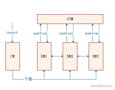 由于在nextval在insert场景下可以下推到DN执行,因此,不管是使用default值的nextval,还是显示调用nextval,nextval都会被下推到DN执行,在上例的执行计划中也能看出,nextval的调用在sequence层,说明是在DN执行的。此时,DN直接向GTM申请序列值,且各DN并行执行,因此效率相对较高。