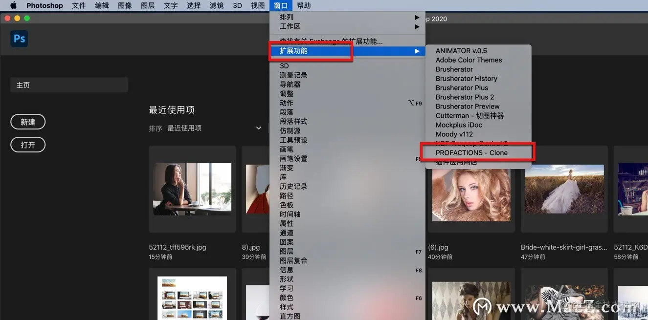 打开Photoshop Mac版,在菜单栏的窗口中找到扩展功能就能看到安装好的profactions.Clone插件了。