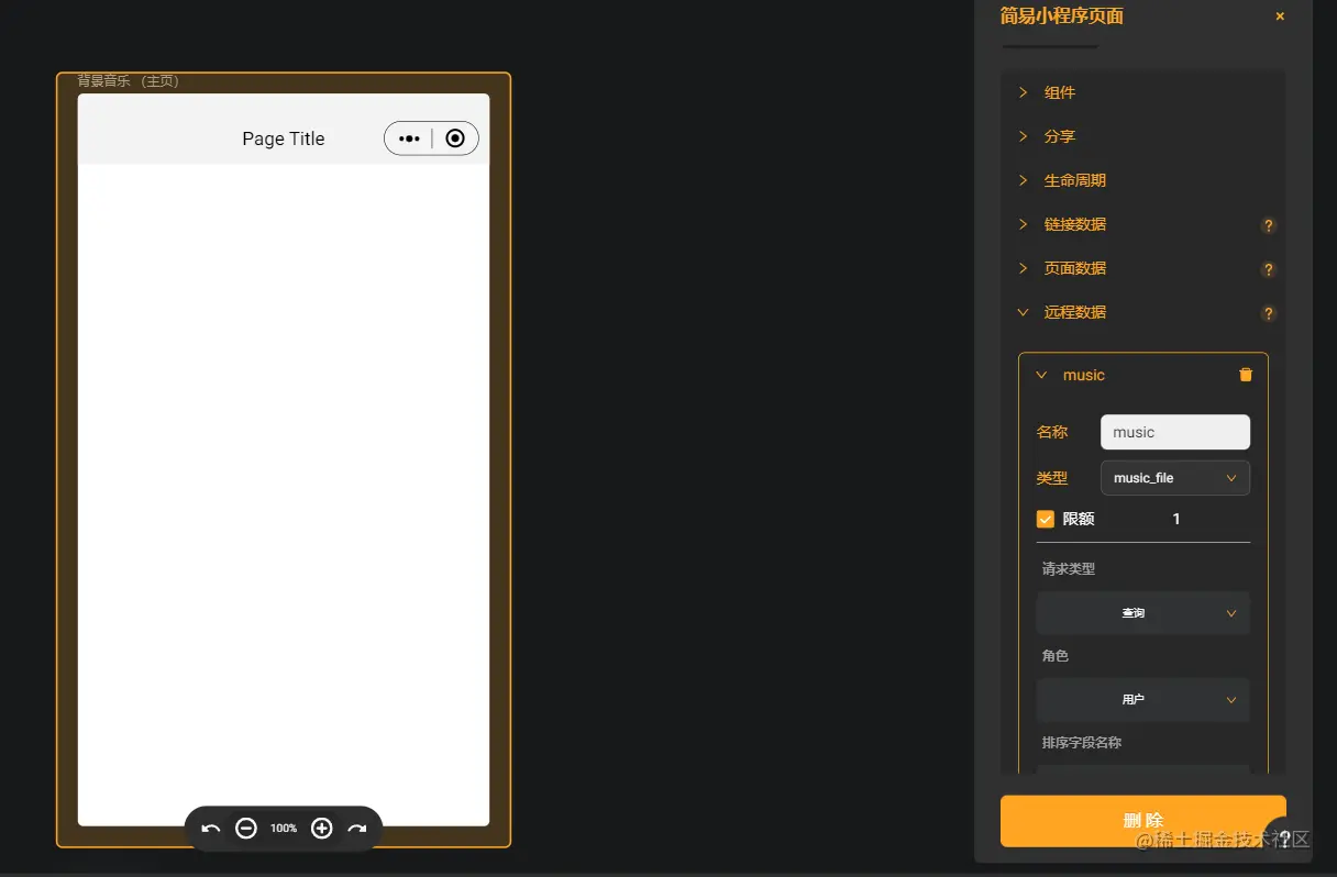 添加一个按钮,为按钮添加行为-媒体资源-音频-播放,数据来源选择远程数据-music-url