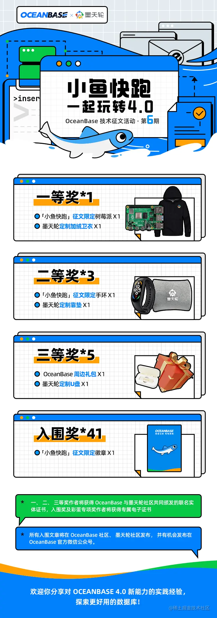 | 一等奖 | 符合征稿主题及基本要求最终评分 60 分以上排名第一名 | OceanBase 定制实体证书 * 1墨天轮定制加绒卫衣 * 1「小鱼快跑」征文限定树莓派 * 1 | 5w | 50元/篇 |