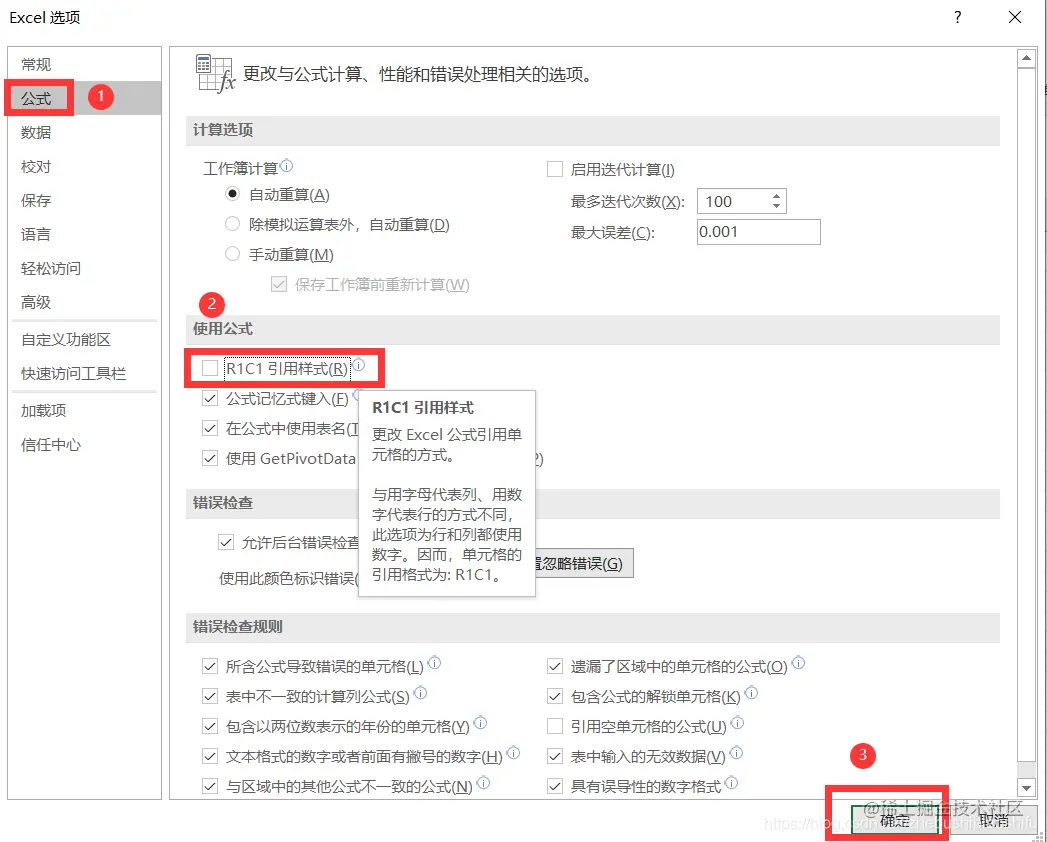随后,点击选择“公式”,并勾选“R1C1引用样式”,然后点击“确定”即可。