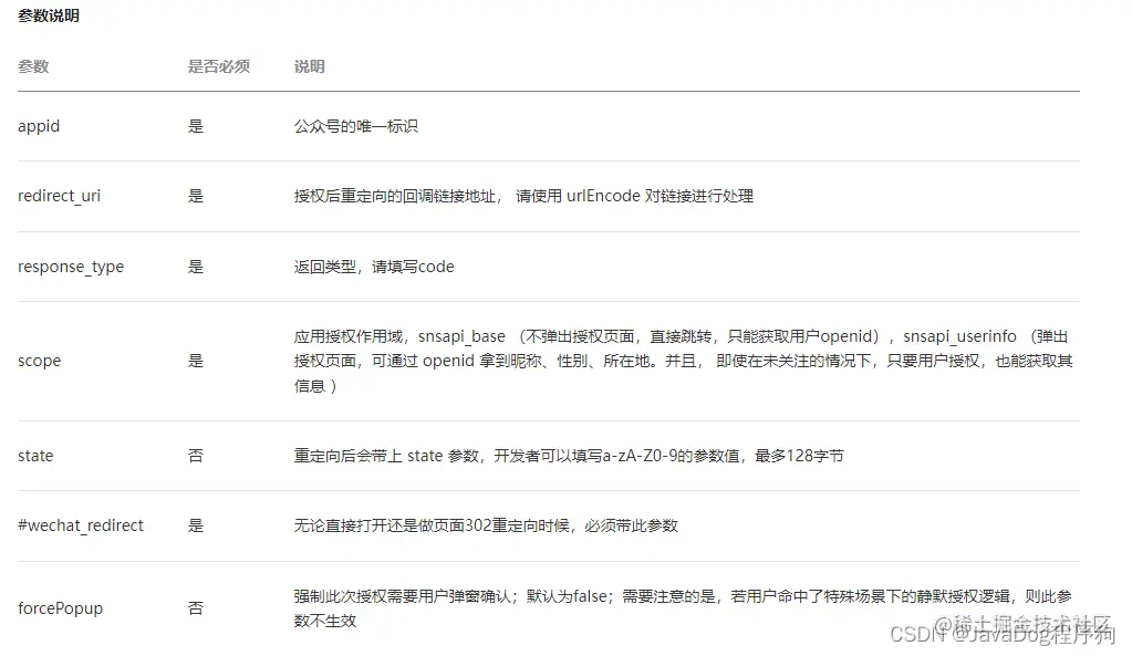 appid :公众号对应的appId redirect_uri:页面回跳地址,也就是当前页面的地址,此地址也就是在上方准备4中OAuth2.0网页授权【授权回调页面域名】填入的值。微信根据这个回调地址进行携带code回跳。