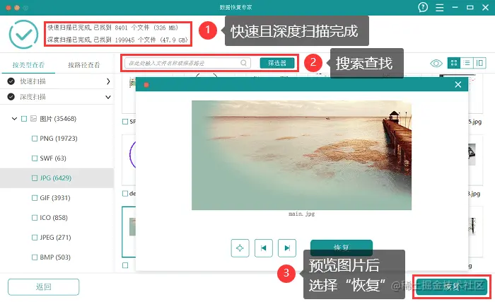 (4)支持扫描结果的筛选和预览,可以帮助用户更准确地找回需要的文件。