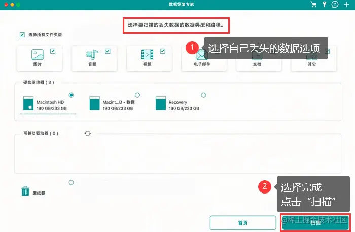 (3)登录完毕,根据Mac系统点击 【Mac电脑数据恢复专家】 。选择丢失的数据选项(文件类型、文件路径),选择完成后点击 【扫描】 。