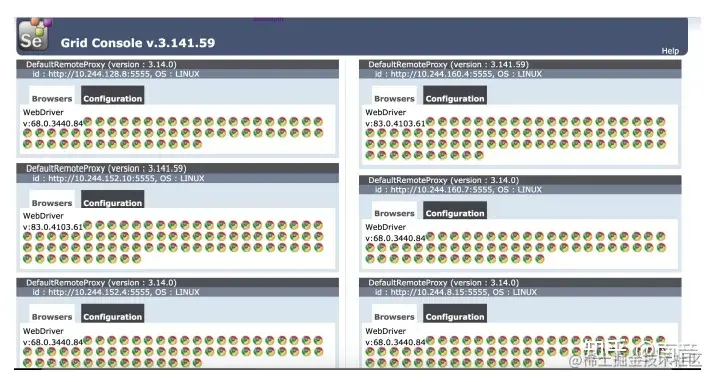 如果能看到上面的图就说明部署已经成功了, 接下来只需要在测试代码中使用 remote webdriver 连接 Master 节点即可。