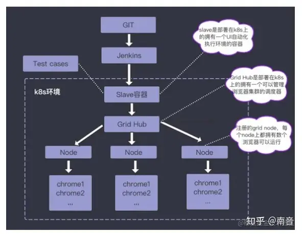 通过前面文章已经了解了 K8S 大概的运行机制,接下来看一下在测试领域中如何用 K8S 来高效的 解决分布式运行测试用例的场景。 在企业中运行 UI 自动化与学习中是不一样的,最大的不同之处就在 于企业的场景中测试用例的量级非常的恐怖, 通常一款超过 2 年的 TO B 类型的产品都会拥有数以千 计的 UI 自动化测试用例。 这个时候测试的运行效率会成为最大的瓶颈。 在这个时候企业会寻求并发 执行测试用例的能力。 一般每种语言的测试框架都会提供相应的并发测试机制, 但是这种机制通常都 是单机的并发能力,而这种并发模型都会存在单机的性能瓶颈, 无法在一台服务器中启动太多的浏览器 执行测试。 所以在测试用例的规模达到一定量级后,寻求多机的分布式执行测试的能力成为了必须的测 试架构。 目前各种领域都提供了一些可用的分布式执行能力,这其中以 Selenium 官方团队的 Grid, 移动端的 STF 和 Cypress 的用例文件分割模式比较流行。下面来介绍一下 selenium 的 Grid 是如何在 K8S 中进行部署的。