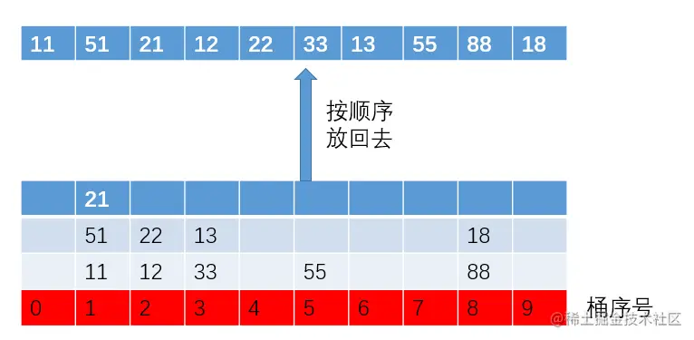 //把每个桶排序好的数据进行合并汇总放回原数组