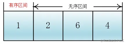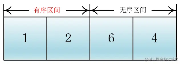 同理,在剩下的无序区间选择最小的元素,将最小元素与无序区间的第一个元素进行交换,交换后原来无序区间的第一个元素就变为有序区间的最后一个元素了,有序区间递增一