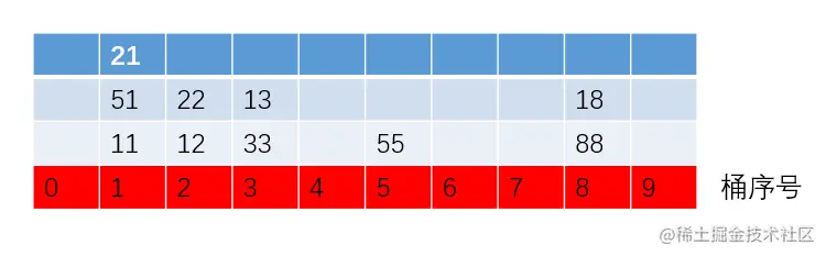 桶排序就是把最大值和最小值之间的数进行瓜分,例如分成 10 个区间,10个区间对应10个桶,我们把各元素放到对应区间的桶中去,再对每个桶中的数进行排序,可以采用归并排序,也可以采用快速排序之类的。