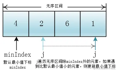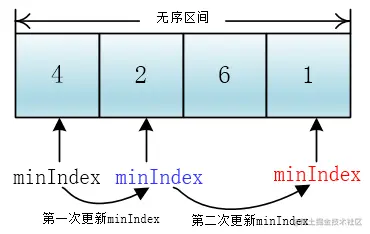 很容易想到:先随便选一个元素假设它为最小的元素(默认为无序区间第一个元素),然后让这个元素与无序区间中的每一个元素进行比较,如果遇到比自己小的元素,那更新最小值下标,直到把无序区间遍历完,那最后的最小值就是这个无序区间的最小值