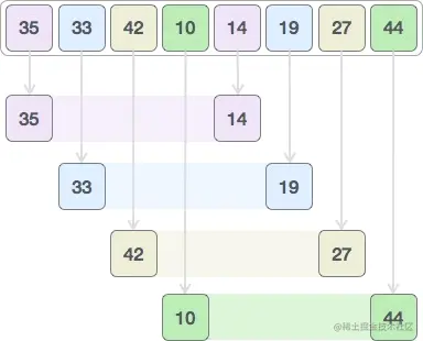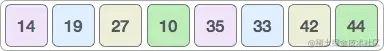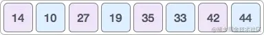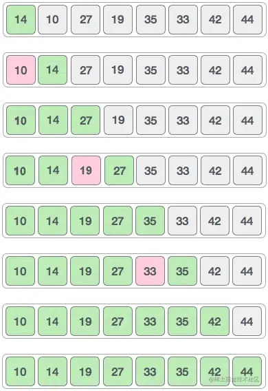 按照这个思路,我们尝试对 {35, 33, 42, 10, 14, 19, 27, 44} 做升序排序,具体的实现流程是: