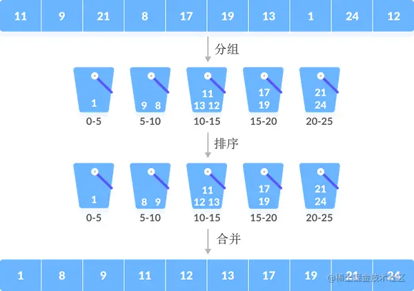 桶排序算法中,待排序的数据量和桶的数量并不一定是简单的“一对一”的关系,更多场景中是“多对一”的关系,例如,使用桶排序算法对 {11, 9, 21, 8, 17, 19, 13, 1, 24, 12} 进行升序排序,实现过程如下图所示: