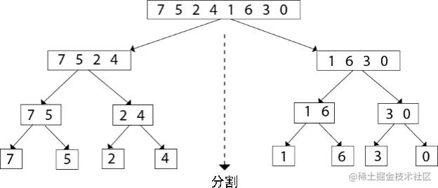 整个序列不断地被一分为二,最终被分割成 {7}、{5}、{2}、{4}、{1}、{6}、{3}、{0} 这几个序列。