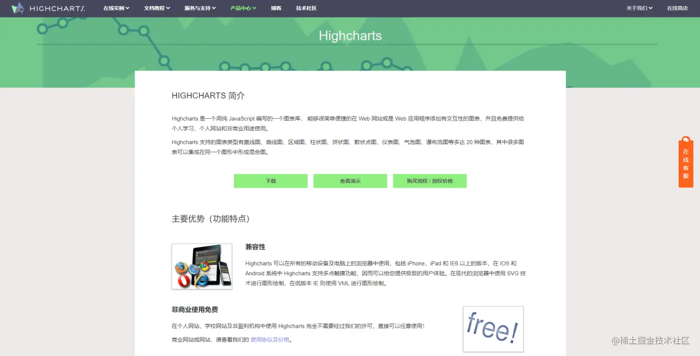 Highcharts是可视化库,商用的话需要付费。优势是文档详细、实例也很很详细,文档中依赖哪些js脚本,css都十分详细,学习和开发都比较省时省力,相应的产品稳定性较强。