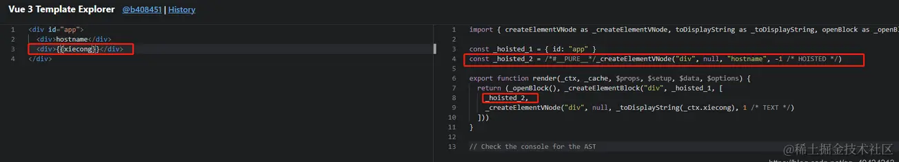 从上面我们就可以看到 hostname 的 div 标签就是标记的 HOISTED -1 即静态标签,不会被 diff 的