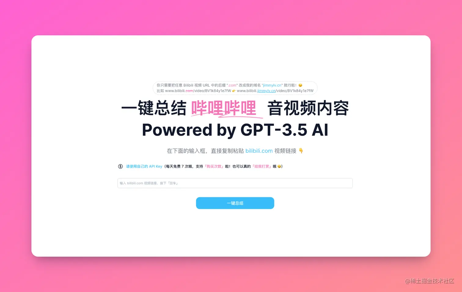 作者@Jimmy_JingLv 的产品,上线几天用户量就突破了几万,AI 自动总结 B站 视频内容,基于ChatGPT 智能提取并总结字幕,很有用。开源的。也看到另外一个类似的浏览器插件 Summary for Bilibili。