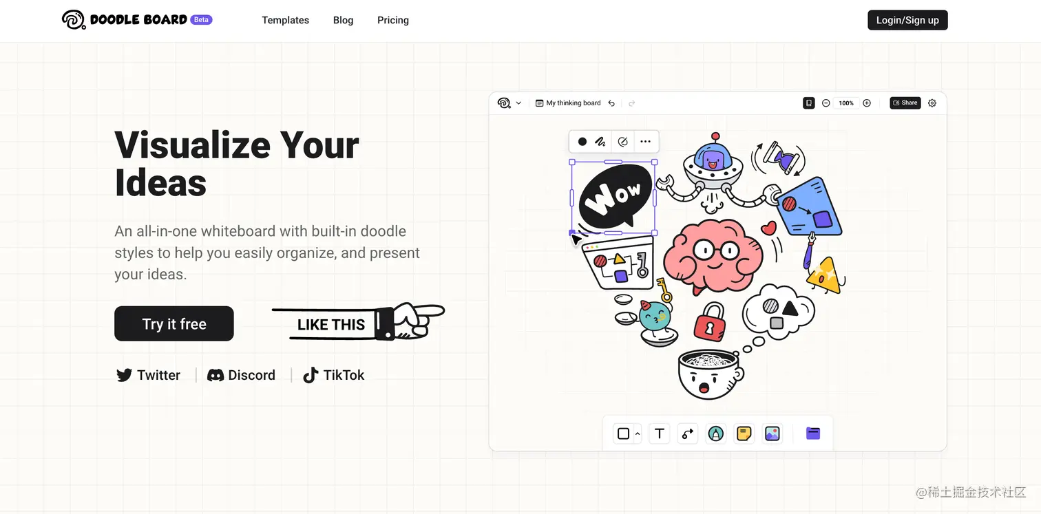 开发者 @MarcChen6174 这是一款独特 doodle 风格的在线白板应用,可以把复杂的想法转化为具有基本形状的涂鸦板,官网也有很多案例。很好看的一个产品。