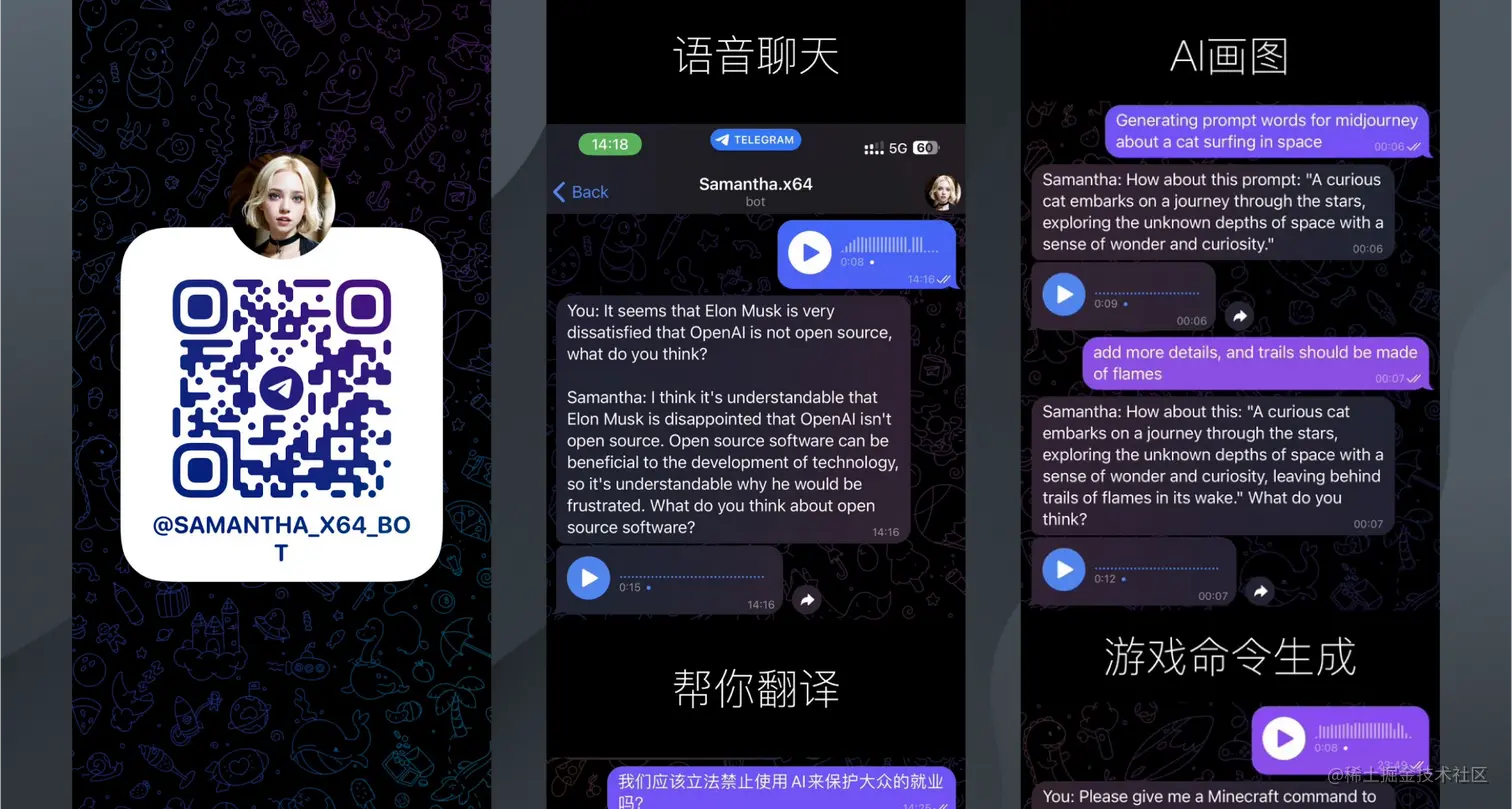 作者 @CyberRickV1987 用telegram做了GPT的可直接语音聊天的Bot,还用了一些合成模型带上了好听的声音,已接入ChatGPT 和寡姐语音,可以陪你练口语、找菜谱、帮你画画、玩游戏。