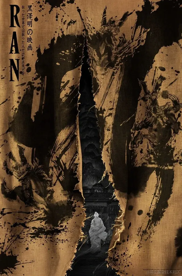 不同于AI浮于表面的拼接构成,这张海报完美融合了电影的风格,海报中帷幕被风撕裂,战国武将一文字秀虎进入“乱”,仿佛置身于战乱之中。帷幕上毛笔写的“乱”字包含了一文字秀虎的三个儿子的画像。也由此,仅从一张海报就让人体会到满满的肃杀感,平心而论,AI是做不到这种恰到好处的创意和融合的。