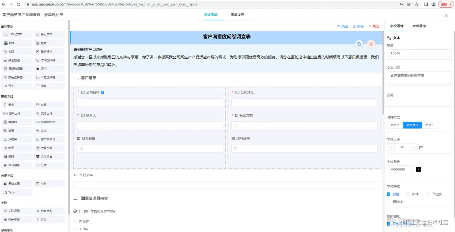 首先看下在调查表中有哪些字段,如下图,一方面是客户需要填写:企业名称、地址、联系人、联系方式、填表日期等信息,另一方面是需要获取客户对产品和服务的满意度情况。