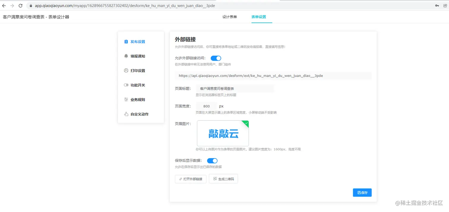 - 发布时可以将“允许外部链接”打开,对“页面标题、宽度、页眉图片、保存后显示数据”进行设置;