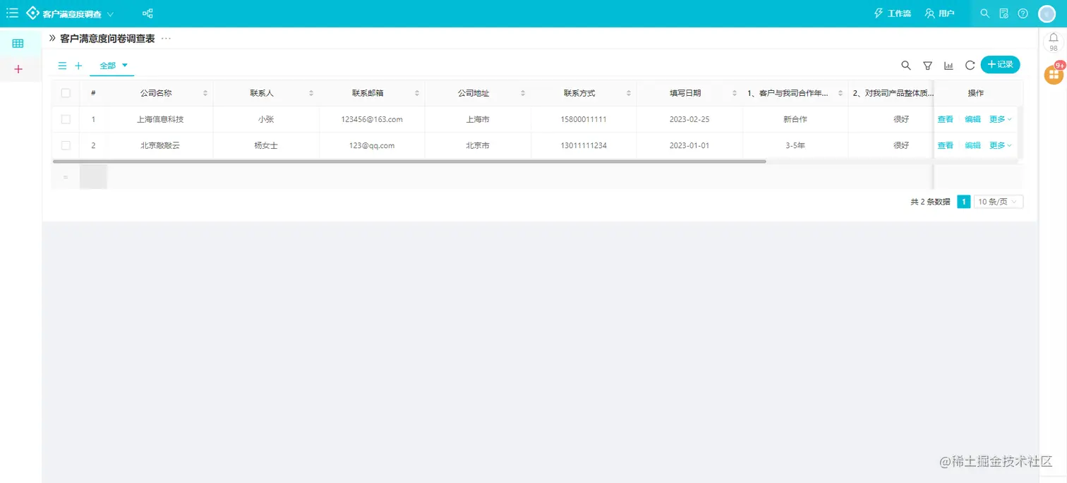 我们发布表单之后填写数据看一下效果,可以看到客户填写调查问卷的信息。