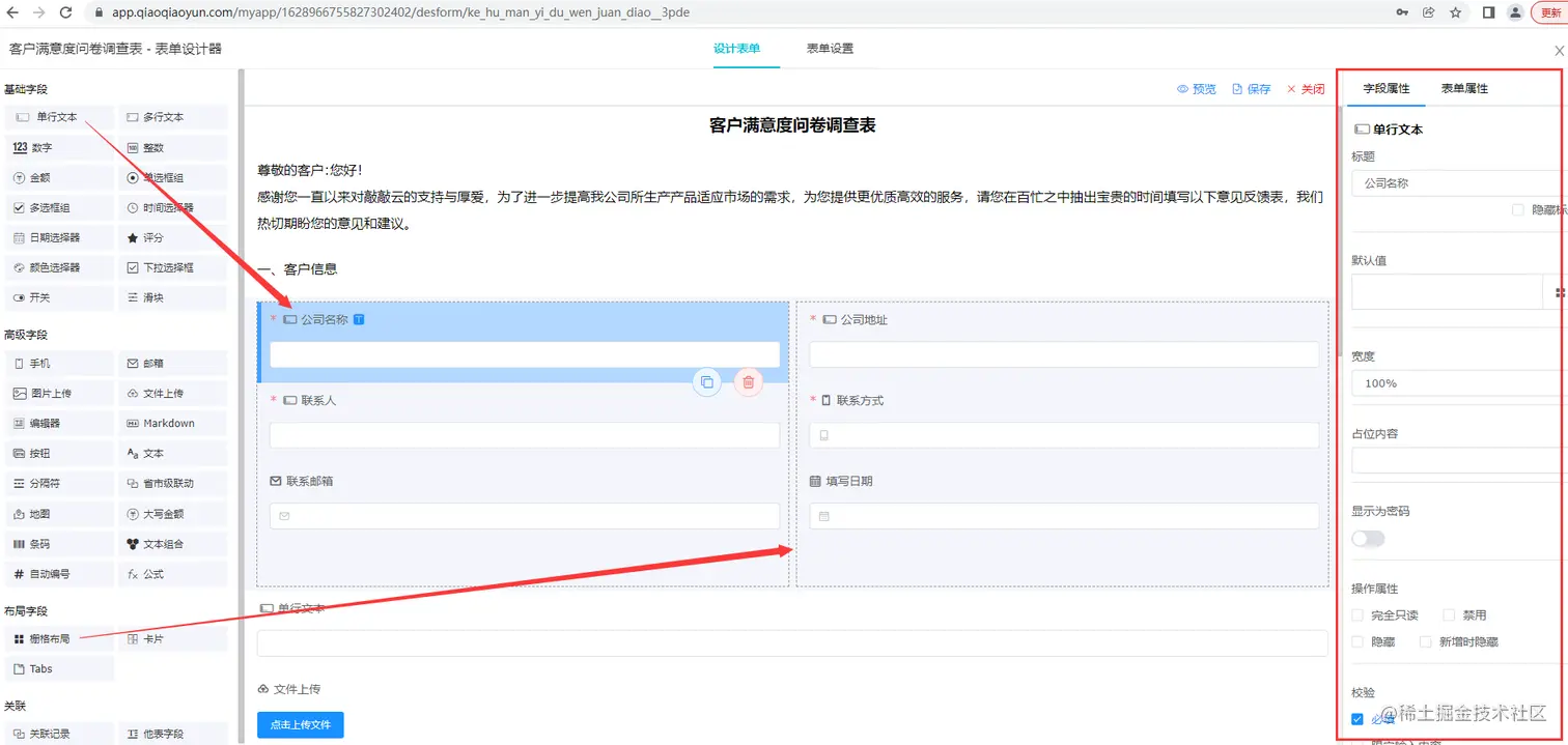 从左侧控件区选择合适的控件,拖拽到中间表单设计的区域,可以对关键属性进行设置修改(字段属性、表单属性),例如名称、宽度、占位内容、必填等;也可以通过布局组件,根据其所需设置布局方式。