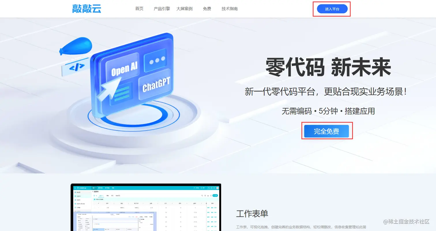 通过浏览器打开qiaoqiaoyun.com, 点击“进入平台”或“完全免费”,注册敲敲云账号。
