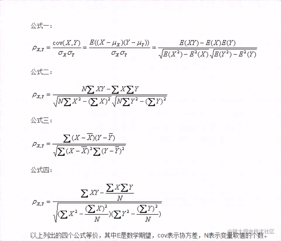 公式定义为: 两个连续变量(X,Y)的pearson相关性系数(Px,y)等于它们之间的协方差cov(X,Y)除以它们各自标准差的乘积(σX,σY)。系数的取值总是在-1.0到1.0之间,接近0的变量被成为无相关性,接近1或者-1被称为具有强相关性。