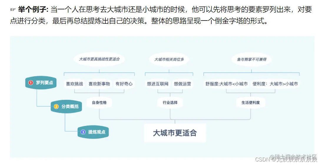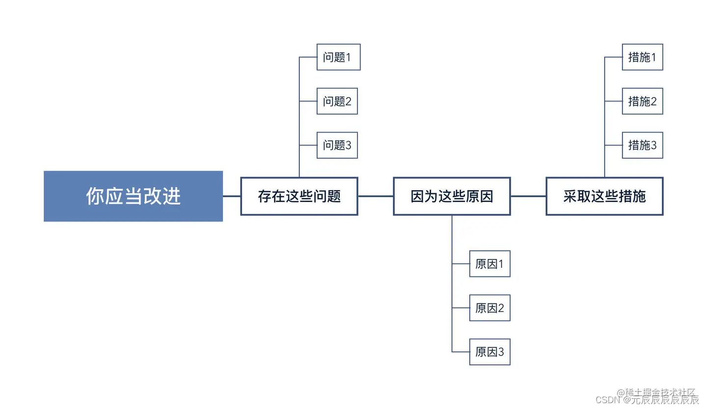 **自上而下表达,结论先行:**当我们先提出总的概念,再列出具体项目,即自上而下地呈现思想时,可以最有效的进行沟通和写作表达,类似于从收敛到发散的过程,脑图结构;