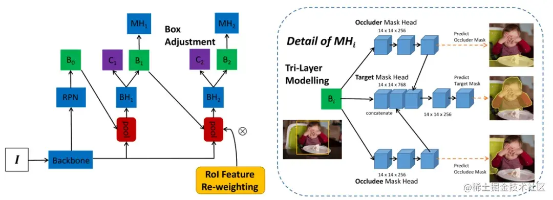 插件一共有三个模块:(a)三层掩码预测头(MHi 详细结构见右边)预测检测框Bi内目标物体的掩码(在脸上擦食物的婴儿)、遮挡物(餐桌)和被遮挡者(椅子)的掩码。occluder/occludee 分支的特征嵌入(embedding)作为线索连接到目标掩码嵌入,以帮助更好地预测目标物体掩码;(b) 如左图所示,迭代预测目标 mask 的过程(索引 i ),使得第二次迭代能够调整初始预测框并更好地检测被部分遮挡/割裂的对象;(c) 第一次迭代后,根据预测的目标掩码对 RoI 特征进行池化,以引导模型更多地关注被部分遮挡/割裂的物体本身。使用的符号是:“I”表示输入图像,“BH”、“MH”、“B”、“C”分别指 bbox head、mask head、bounding box 和 classification。