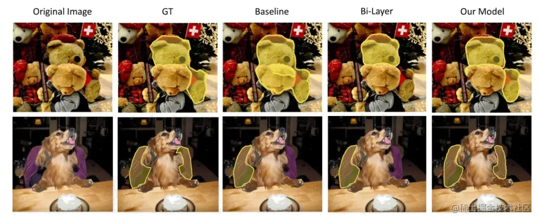 COCO val 上的定性结果可以看出,基线模型在具有挑战性的遮挡情况下往往会失败,要么过度分割(over-segmentation)被部分遮挡的物体(第 1 行),要么对被割裂的(第 2 行)物体分割不足(under-segmentation)。本文提出的插件在很大程度上改进了对被遮挡物体的检测,例如,消除泰迪熊的歧义(第 1 行),并推断出被狗严重遮挡而割裂的椅子(第 2 行)。有关更多示例,请参见论文原文附录。
