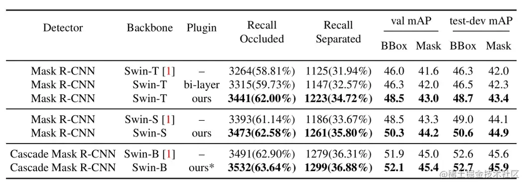 与不同架构上的 state-of-the-art 进行比较可见,该插件提高了所有架构的性能,即使是最强的检测器(Swin-B + Cascade Mask R-CNN)。
