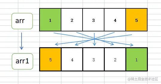 将数组长度除以二,以中间为界,将左右两端的元素依次交换,如:下标0与下标arr.length - 1互换,下标1与下标arr.length - 2互换,以此类推。