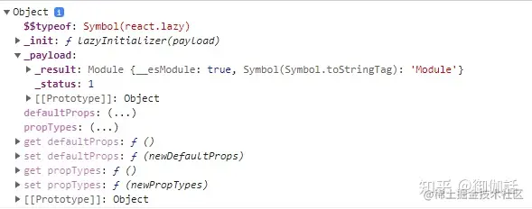 lazy(ctor) 函数返回了一个 Object 结构,React 将其定义为一种特殊的虚拟DOM结构——LazyComponent,与其他类型的虚拟DOM数据结构不同,LazyComponent 带有一个 _init 函数,作为组件初始化函数: