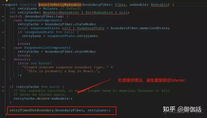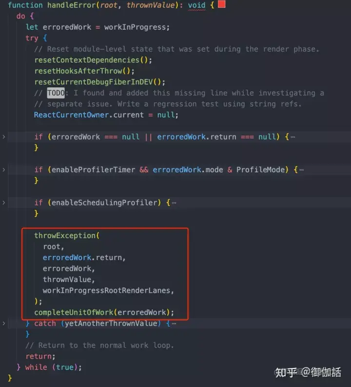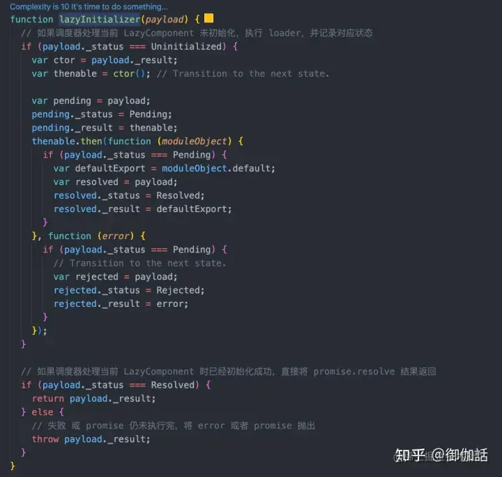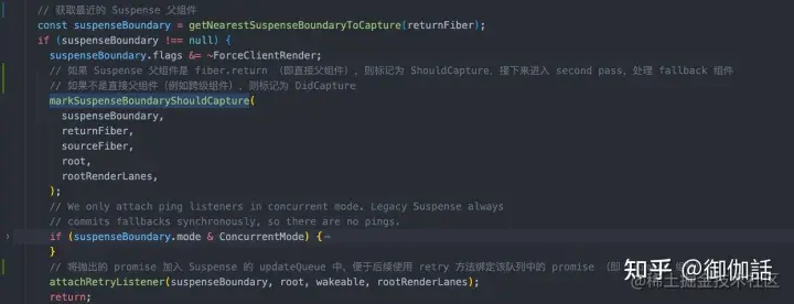 细心的小伙伴一定发现,前文 renderRootSync 方法循环中的 catch block 处理了动态加载的场景:lazyInitializer 抛出的 promise 向上传递,直到 workLoopSync 方法外被 catch 住,尚未加载完成的组件 promise 传入了 handleError 函数中。