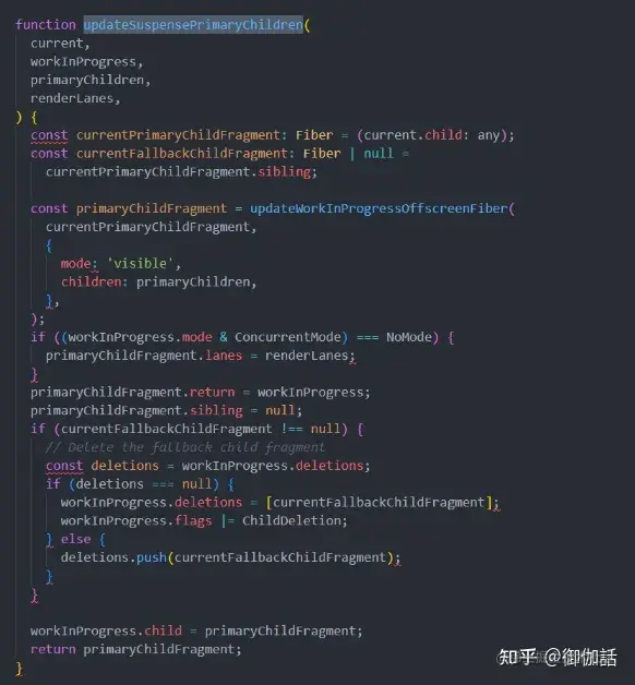 回看 updateSuspenseComponent 函数中,另一种场景下,current 字段不为 null,逻辑大体相似,只不过调用的方法由 mountSuspensePrimaryChildren/mountSuspenseFallbackChildren 变为了 updateSuspensePrimaryChildren/updateSuspenseFallbackChildren。这里我们直接进入分析流程,在首次加载 primary 后,Suspense 的工作流为: