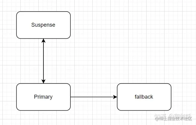 可以看出,second pass 的作用就是将 primary 和 fallback 串了起来,然后给 Suspense 再次挂上。这是因为后续等 primary 组件加载完成后,保持这样的 Fiber 结构可以继续流转至 primary 组件进行加载。用一个流程图可以很清晰地表示其中的逻辑:
