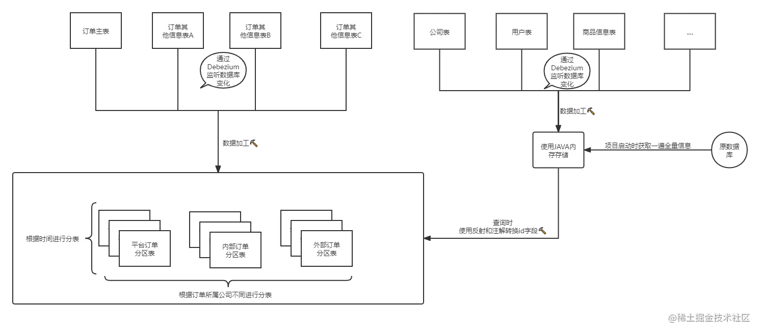 此时已经明确了优化方向 , 原有的数据和结构不做调整 , 先通过Debezium监听数据库 , 把订单的变化投送到Kafka中, 之后解析Kafka消息 , 把订单信息实时聚合并同步到另一个数据库中 . 使四张大表组合成一张单表 , 同时在聚合中剔除冗余字段以及非查询相关字段 , 最后拼装的单表只有五六十个字段 , 大大缩小了表体积.