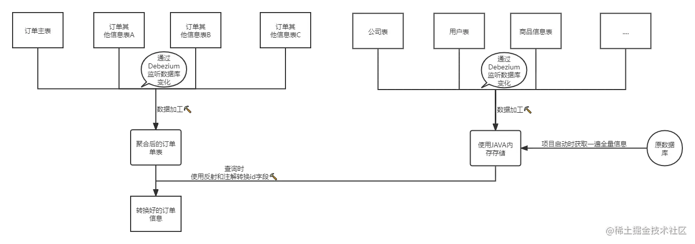 现在已经有了订单数据 ,但由于新的数据库并没有公司名称,用户名称等基础信息 ,所以需要解决字典名称转换的问题 . 该问题的处理方案与订单类似 , 即需要使用Debezium监听这些字典表 , 不同的是这些映射关系存储在java内存中 ,当前端需要显示相应信息时,利用注解和反射在java层完成字典key到value的翻译 . 此时的架构如下: