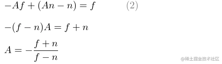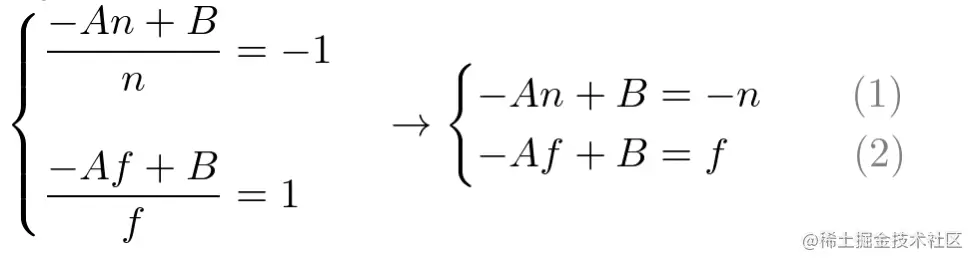 利用 ==> 的映射关系 clip space(-n, -f) ==> NDC space(-1, 1),得到: