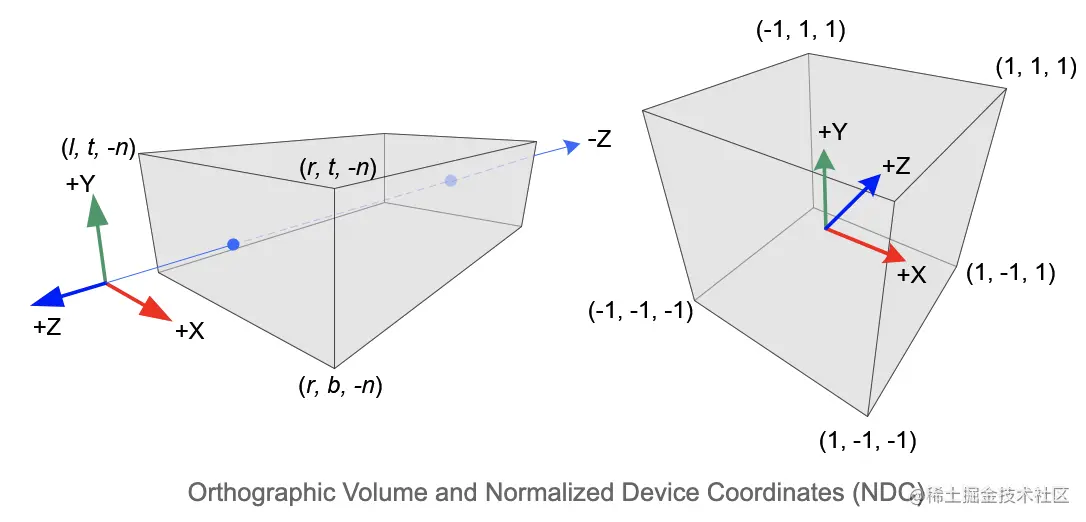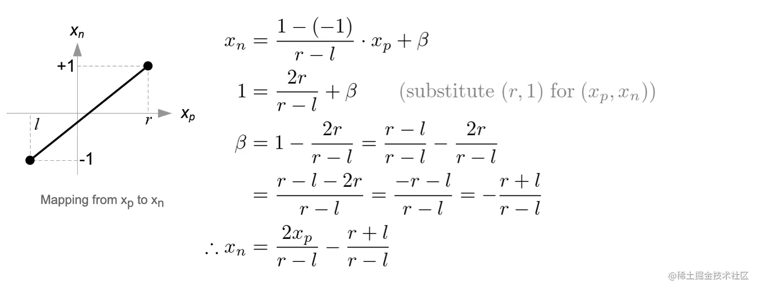 按线性关系,建立投影坐标到NDC空间坐标的变换(l, r)=>(-1, 1), (b, t)=>(-1, 1),clip坐标经过一次缩放和一次平移得到NDC 坐标。