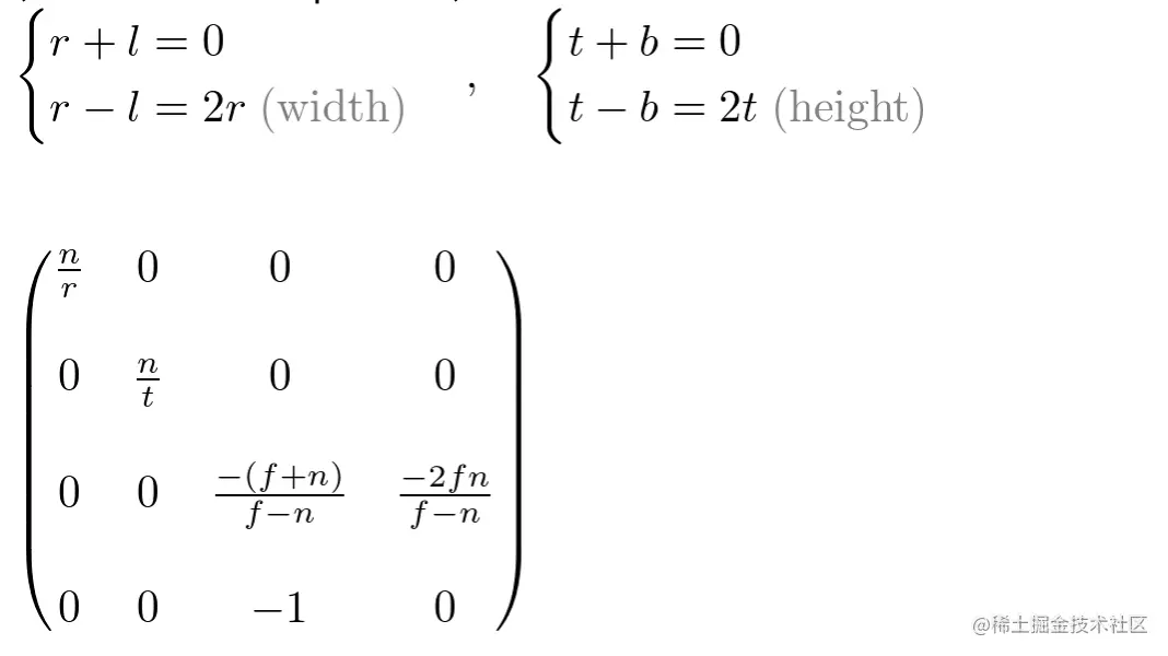 上面是通用的投影矩阵,如果视锥是对称的,即r = -l, t = - b,则该矩阵可以简化为: