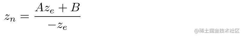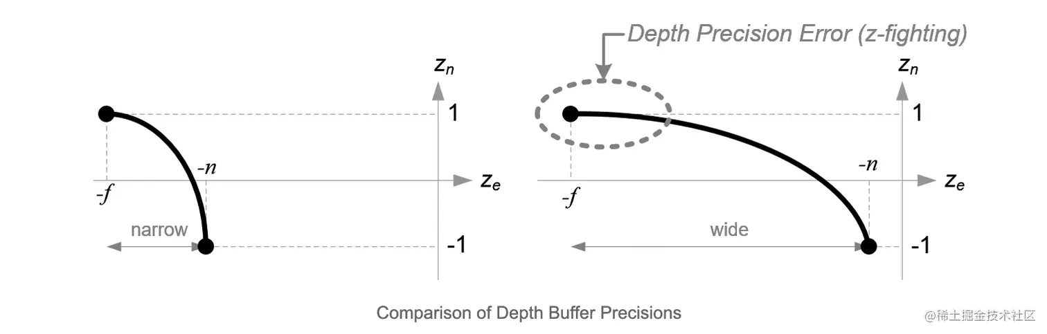 注意: 投影矩阵之后需要除以w项,才能得到NDC空间坐标(-1, 1),w = z。则从z_clip 到 z_ndc,是一个类似 f(z) = 1/-z 的函数,